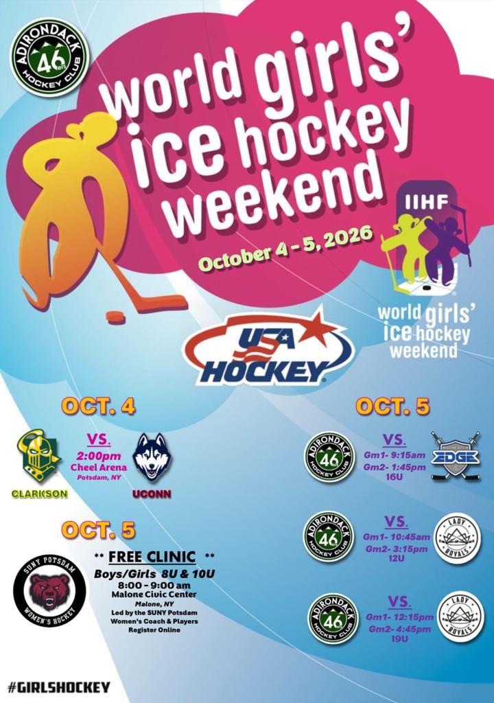 The Adirondack 46ers Hockey Club, which is part of Malone Minor Hockey (recipient of the prestigious USA Hockey 2023 Female Honors Award), was created in the spring of 2017 with a 12U girls team and a 2005 boys team. The 46ers were built to create a hockey club for players to progress through at a competitive level, and the club has now grown to be comprised of Girls 8U (split season), 10U (split season), 12U, 14U, 16U, & 19U tier II teams and Boys 12U (split season), 14U (split season), 16U & 18U tier III teams, and several spring/summer teams for the 2024-2025 season.